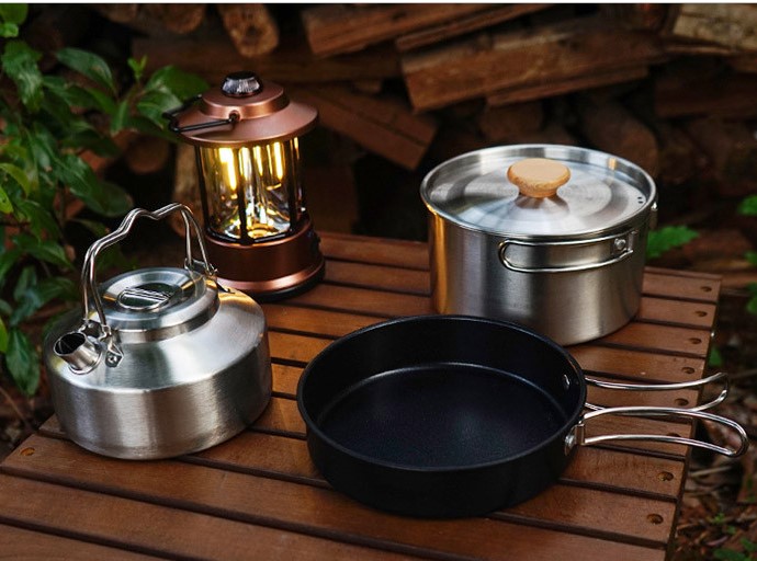 주전자, 프라이팬, 냄비로 구성되어 있어 캠핑장에서 유용하게 사용할 수 있습니다. 프라이팬으로는 계란후라이나 소세지를 조리하고, 주전자로는 커피를 끓일 수 있으며, 냄비로는 라면을 손쉽게 끓일 수 있습니다. 다양한 요리를 한 번에 해결할 수 있는 효율적인 주방 아이템입니다.