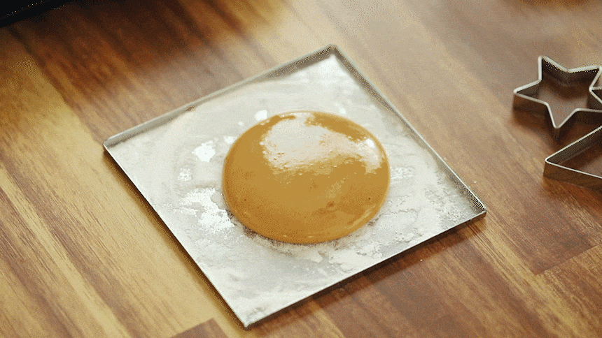 설탕을 녹여 캐러멜화된 액체 상태가 되면 소다를 약간 넣어 부풀린 뒤, 평평하게 펴서 모양틀로 찍어냅니다.