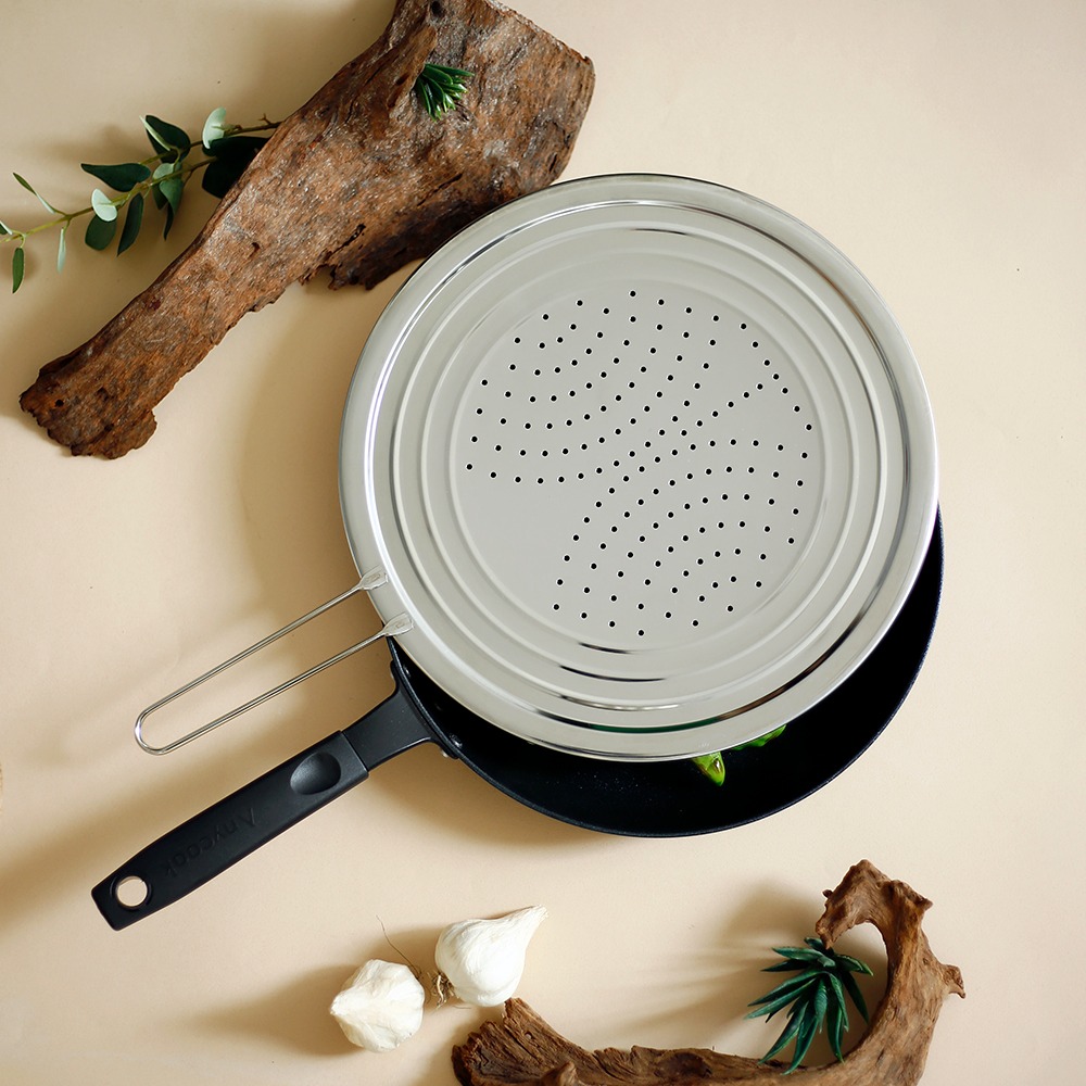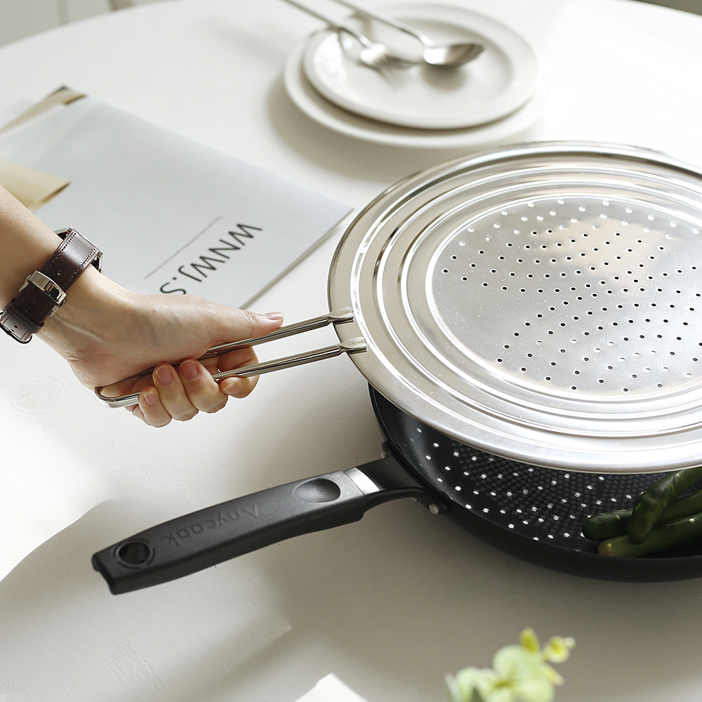 다용도 스텐 기름방지망 플라라 후라이팬 덮개입니다. 구멍이 뚫려있어 수증기 배출 및 냄새제거에 탁월한 스테인리스 스틸 뚜껑으로 기름튈 염려없이 안전하고 깨끗하게 요리를 즐길 수 있습니다. 또한 28, 30, 32cm 후라이팬 지름에 알맞은 3단의 홈이 있어 더욱 편리하게 사용할 수 있어요.