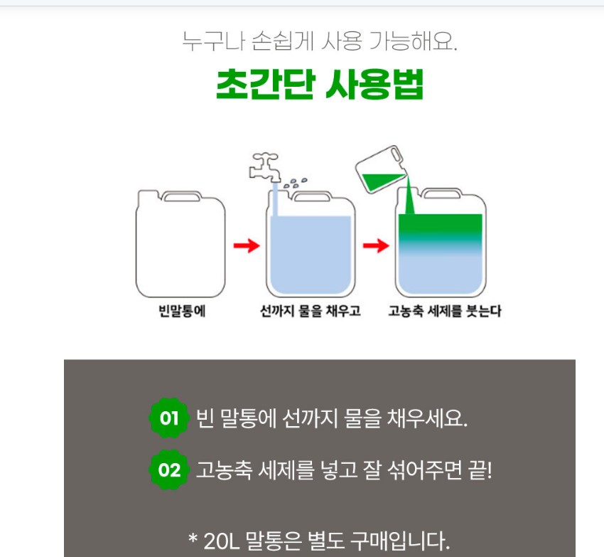 고농축 원액 1L→ 물 17.85L와 희석해서