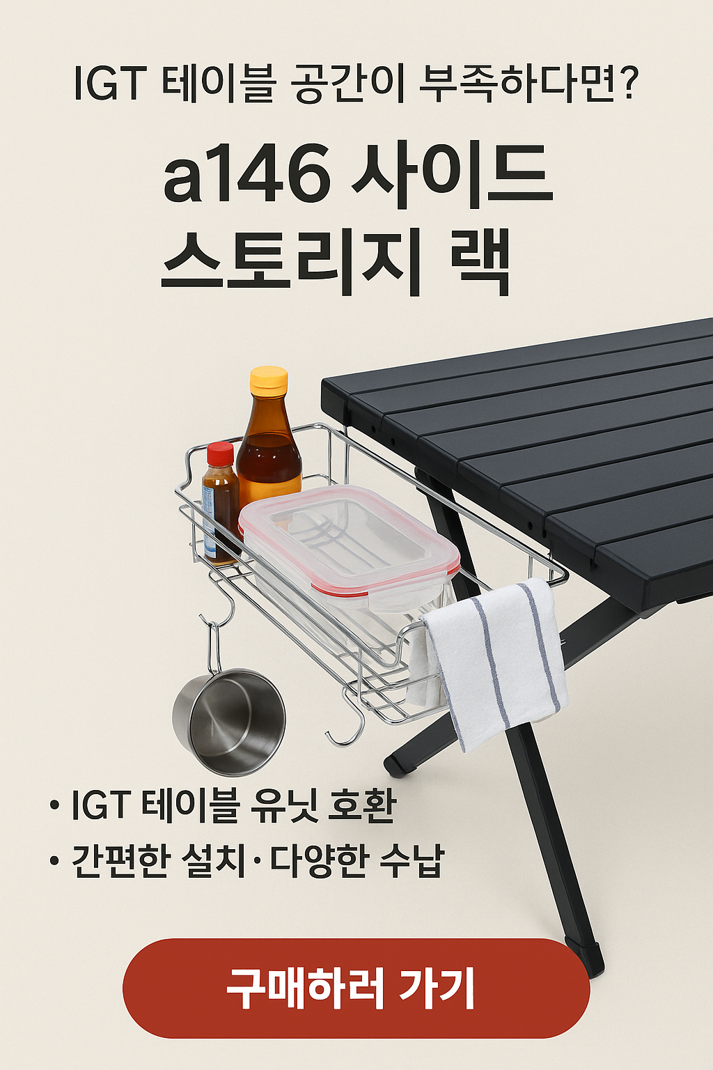 이럴 때 필요한 아이템이 바로 IGT 캠핑 테이블 전용 사이드 스토리지 랙 바스켓입니다.