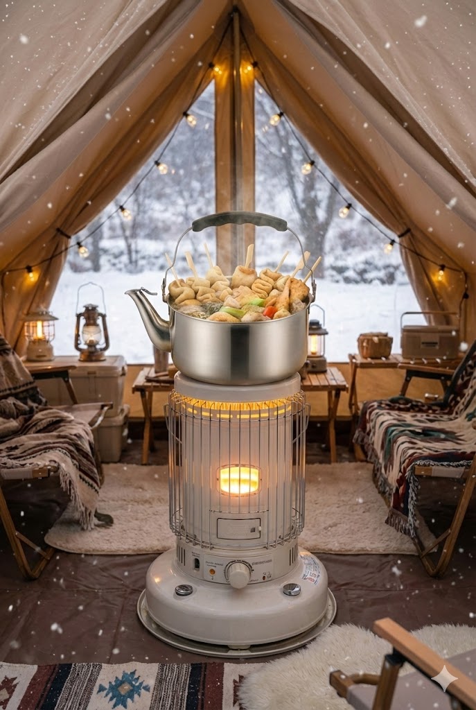 "겨울 캠핑의 로망, 난로 위 주전자 하나로 끝냈어요."