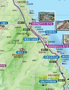 물흐르는 계곡도 있고 , 바닷가 해수욕장과 해양 ~~ 레일바이크타는 곳도 있어요,삼척 용화리 용화 해수욕장>>> 백사장 길이 1km, 수심1~1.5km로, 삼척시에서 남쪽으로 24km 떨어져 있는 해수욕장이다. 자그마한 해변이 반달처럼 휘어져 아담하며, 해변 뒤에는 소나무 숲이 우거져 있고 양쪽 끝은 기암절벽이 어우러진 아름다운 곳이다. 해수욕장 가운데로 용화천이 흘러 담수욕을 할 수 있고, 파도가 높지 않아 밤낚시도 즐길 수 있다. 말굽재에서 바다, 해수욕장, 마을을 한눈에 조망할 수 있다. ※기암절벽 기이한 모양의 바위와 깎아지른 듯한 낭떠러지를 일컫는다. 특이한 지형 경관으로서 눈길을 끈다. |가는길 태백시→35번 국도→황지교 사거리 우회전→38번 국도→통리 삼거리 우회전→427번 지방도→동막 교차..