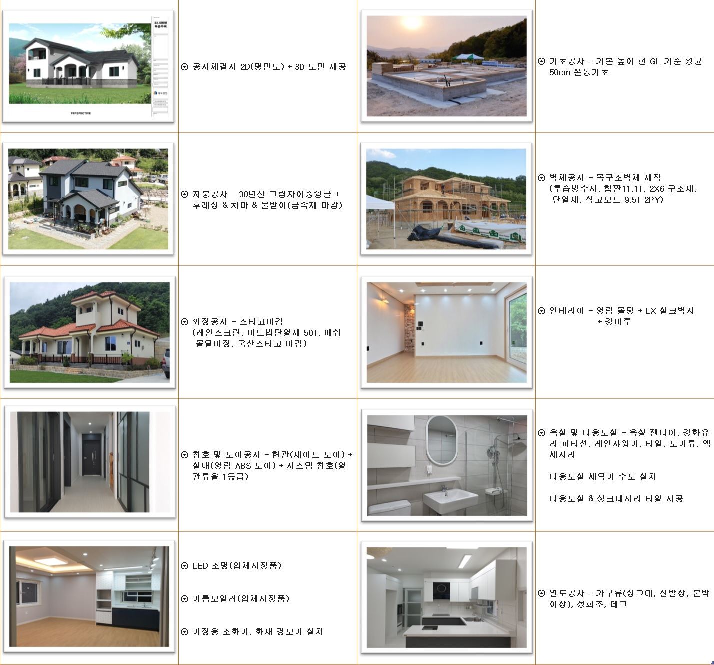 - 벽체공사: 목구조 벽체(2×6 구조체, 단열재, 석고보드 9.5T 2PY)