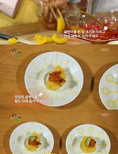반응형 해피투게더32 KBS 2TV '해피투게더3' 야간매점 이다해 황도 시집가는 날, KBS 2TV '해피투게더3' 야간매점 이다해 황도 시집가는 날, 재료 황도, 골뱅이 고추장 양념, 오이 조리법 반으로 자른 황도에 골뱅이 무침을 올려준다. 이때 골뱅이 무침은 고추장 양념을 잘 조절해야 한다. 이후 그 위에 오이로 장식만 해주면 보기 좋게 완성된다. 사진출처 KBS 2TV '해피투게더3'> 2013. 2. 10. 해피투게더3-야간매점 홍인규-홍태경 부자 '눈물젖은 달걀빵' 1월24일 방송된 KBS 2TV '해피투게더3-야간매점 제 21호 메뉴 홍인규-홍태경 부자 '눈물젖은 달걀빵' 계란빵 재료 계란, 핫케이크 가루, 우유 레시피 홈메이드 달걀빵은 우선 핫케이크가루 와 계란을 풀어 반죽을 만들어 준다. 곱게 섞어준 반죽을 종이컵에 넣은 다음 달걀 하나를 추가한다. 이때 전체 양은 종이컵 절반을 넘지 않게 .. . 마지막으로 입맛에 따라 소금 간을 해준 후 전자렌지에 1분30초나 2분가량 돌려주면 달걀빵이 완성!!! 참!! 쉽죠~~ 2013. 1. 25. 이전 1 다음 반응형